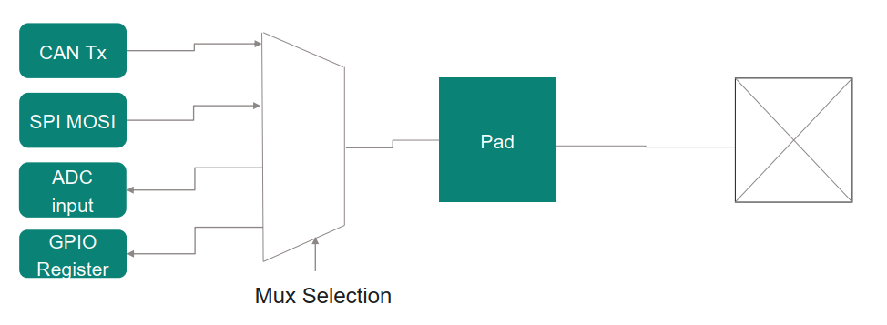 Figure 1: The Multiplexer allows one physical pad to serve many different masters, selected by software configuration.