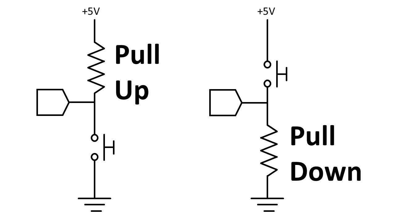 - Pull-Down: We connect the pin to Ground through a resistor. Default state is Low (0).