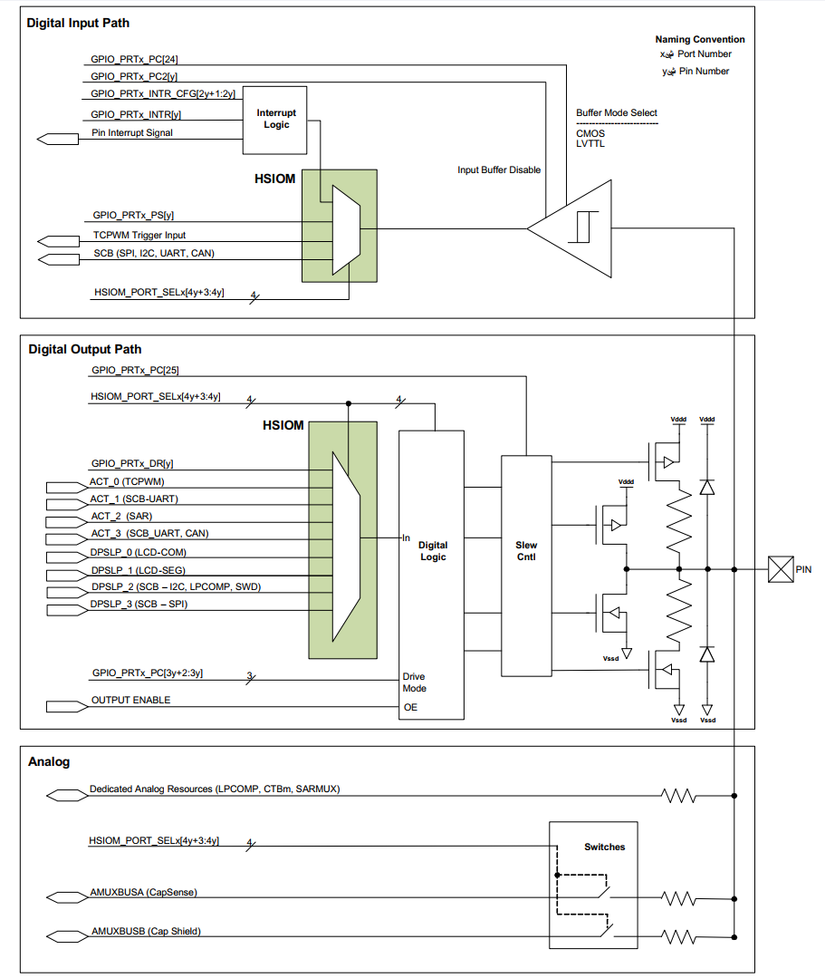 - The Output Path: The signal goes from the digital logic, through the HSIOM, to the drive circuitry (Open Drain or Push-Pull transistors).