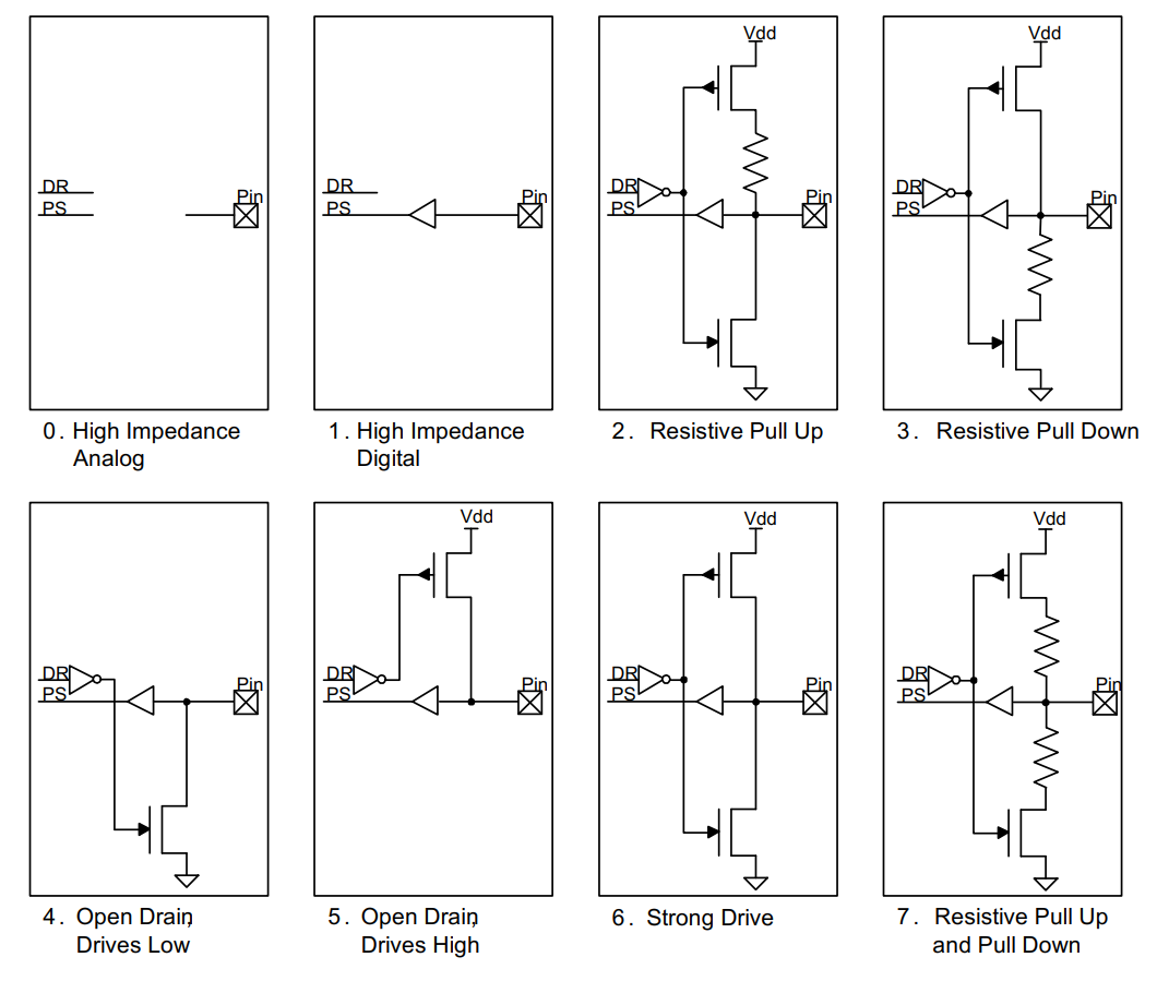 - Mode 7 (Resistive Pull-Up and Pull-Down): Standard resistive pull-up and pull-down output.