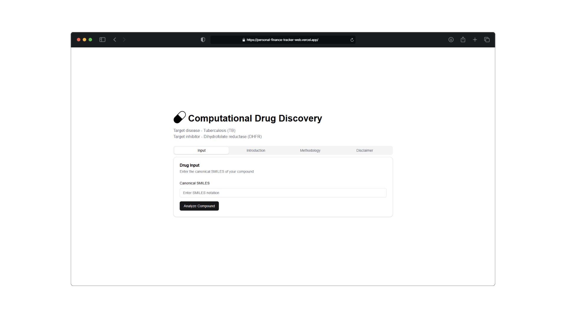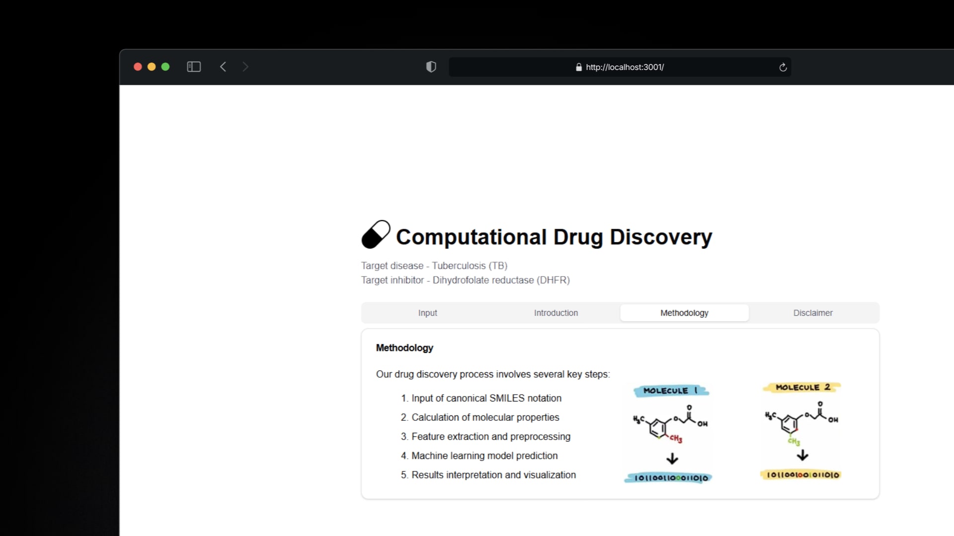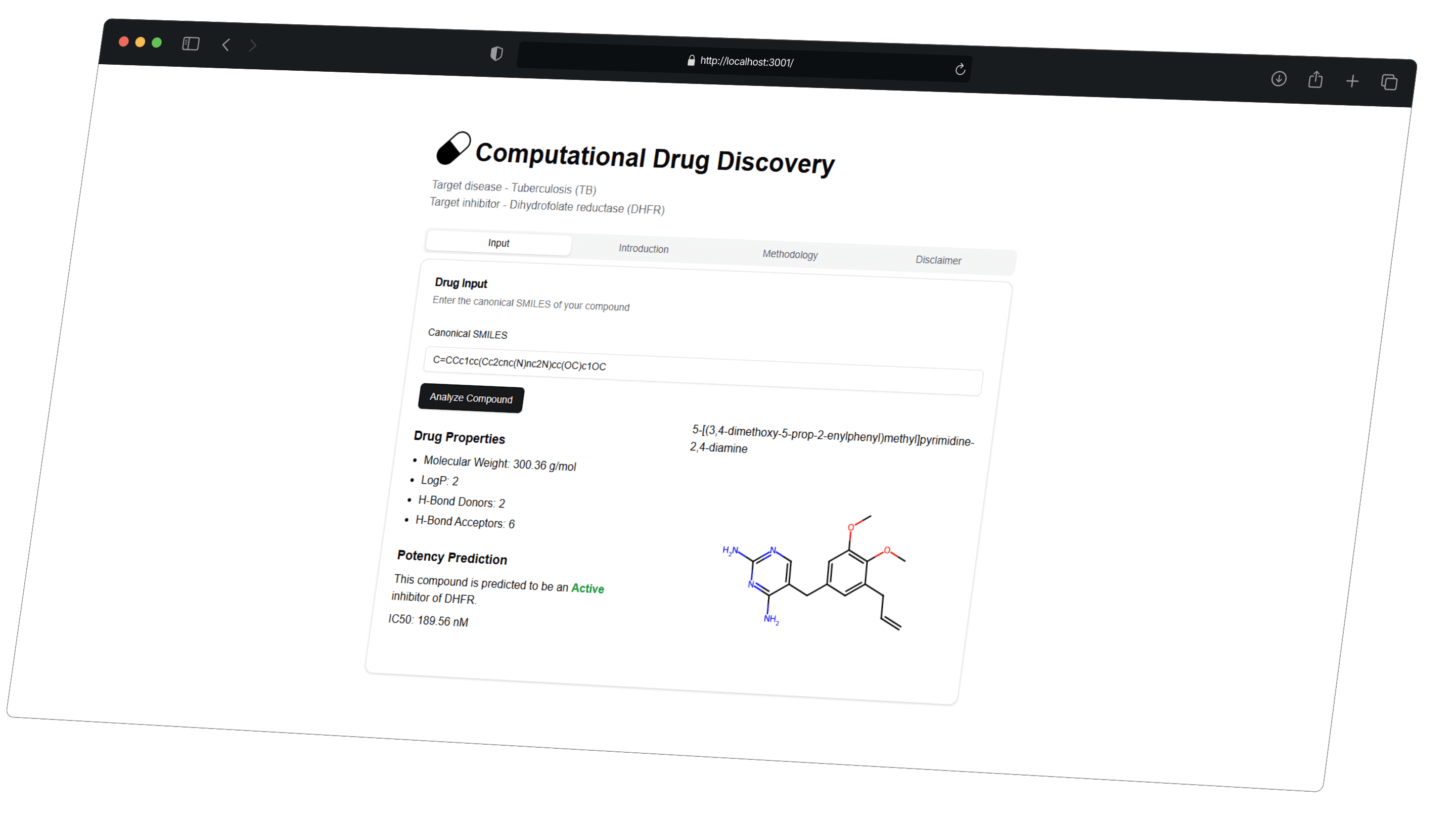 Computational Drug Discovery Tool leverages machine learning and QSAR analysis to accelerate the identification of potential Tuberculosis (TB) drugs targeting the DHFR enzyme. By simply inputting a canonical SMILES notation, researchers can predict the efficacy of a compound, reducing the reliance on expensive and time-consuming traditional drug discovery methods. This AI-driven approach aims to combat drug-resistant TB by streamlining the search for effective inhibitors, making TB treatment development faster and more efficient.